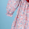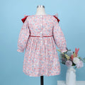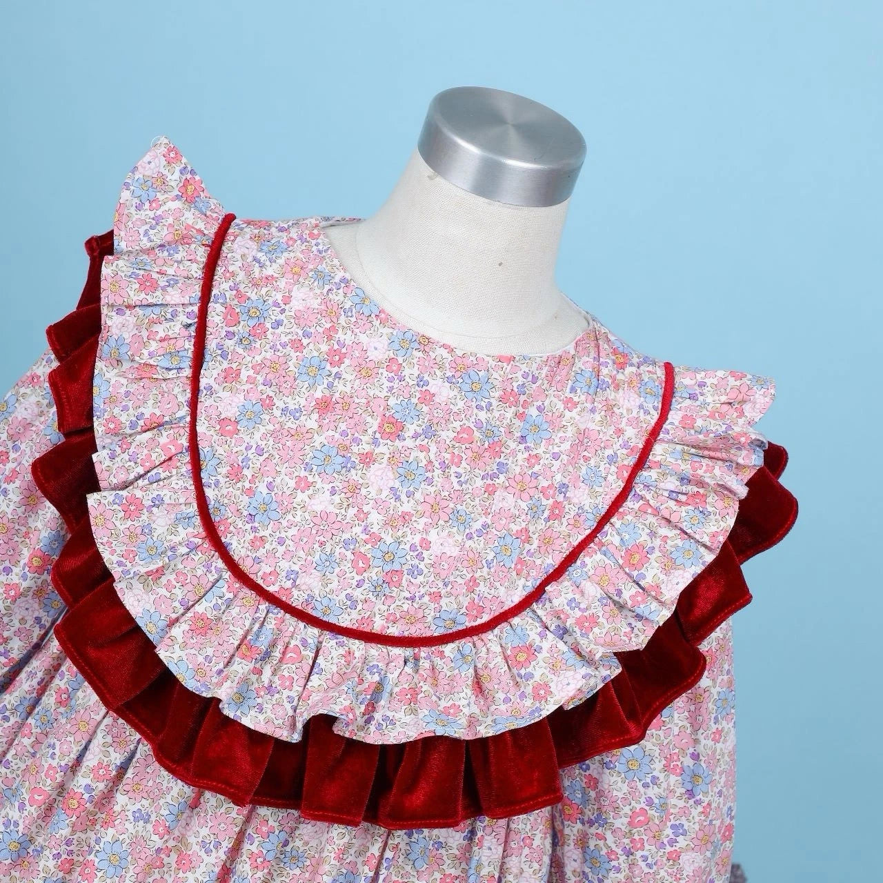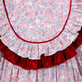 Adorable vintage floral baby girl and older girls dress with luxurious red velvet frill trim. Made from 100% soft cotton, gentle on delicate skin and comfortable for all-day wear.